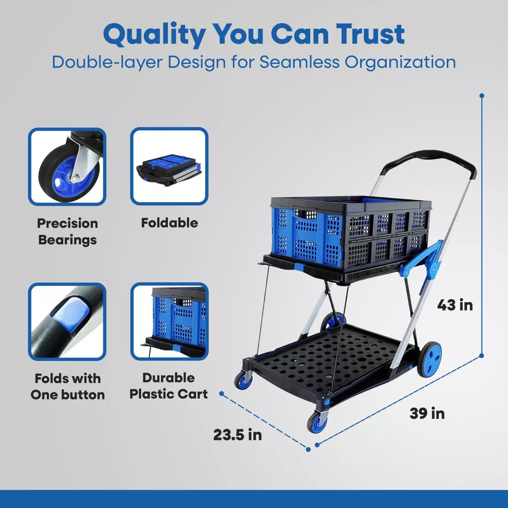 Magna Cart 2-Tier Folding Shopping Rolling Crate Cart, Grocery Cart with Collapsible Utility Tote Crate and Brake System, Black/Blue